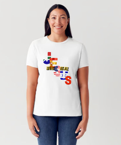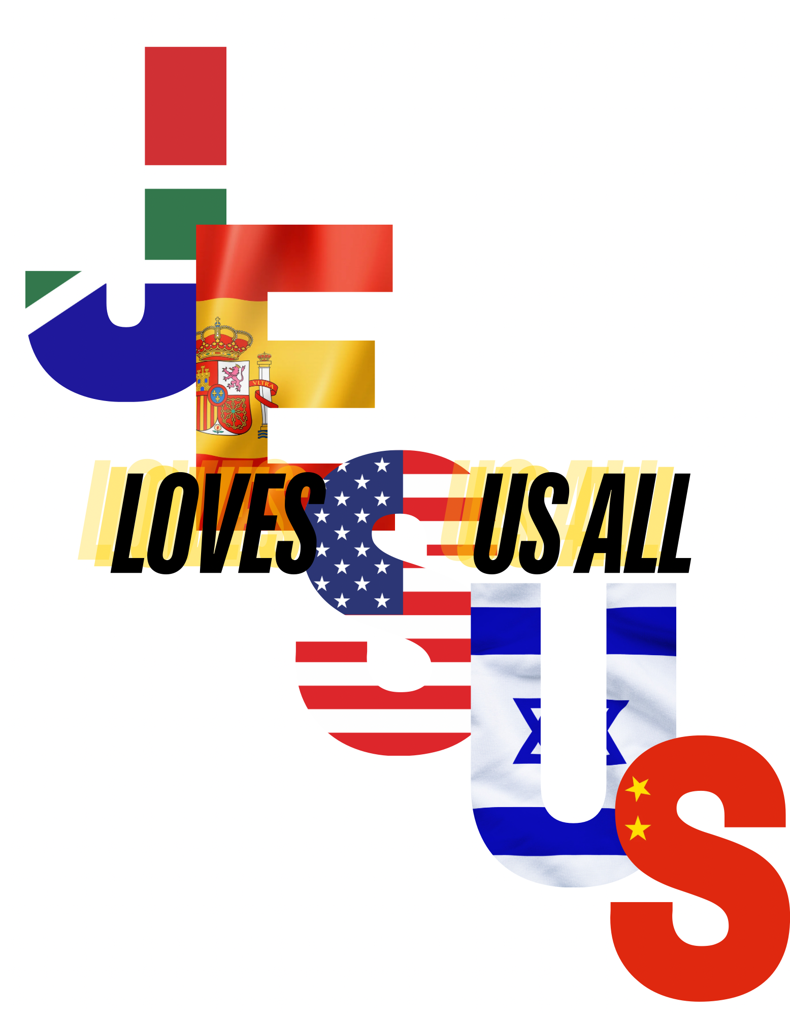 Show your love for Jesus with this t-shirt featuring vibrant flags of different nations. Spread a message of love and unity with this must-have wardrobe staple.
